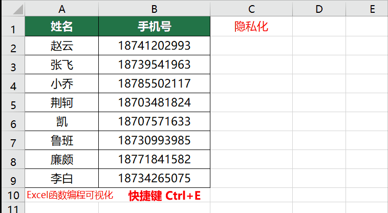 手动输入第一个员工隐私化后的手机号码,接着选中所有需要填充的单元格,同时按下Ctrl+E两键,完成填充。